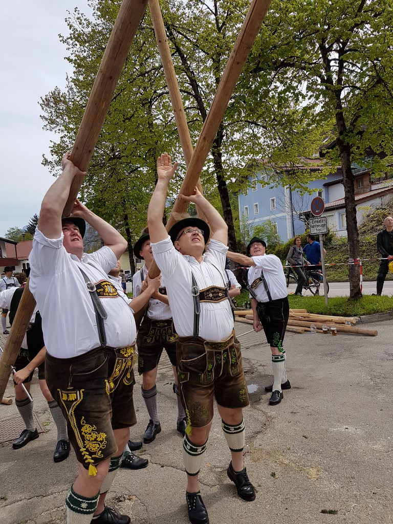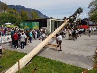 Bereits um 6.00 Uhr in der Früh traf man sich und schnitt den 30 Meter langen Maibaum um. Gegen 10 Uhr war der Baum dann auch schon geschmückt, sodass pünktlich um 12 Uhr mit dem Aufstellen begonnen werden konnte. Bei Grillspezialitäten, selbstgemachten Kuchen und erfrischenden Getränken ließen es sich die rund 500 Zuschauer gut gehen und folgte trotz zweifelhafter Wettervorhersage bei herrlichem Frühlingswetter und hervorragender musikalischen Unterhaltung durch die „Hallgrafen-Musikanten“ dem ganzen „Spektakel“ in gemütlicher Atmosphäre. Schon nach knapp zwei Stunden stand der Baum. Bis zum Wetterumschwung wurde das gelungene Aufstellen noch gefeiert. Der Verein bedankt sich noch einmal bei allen Helfern, ohne die dies alles nicht so funktionieren hätte können.